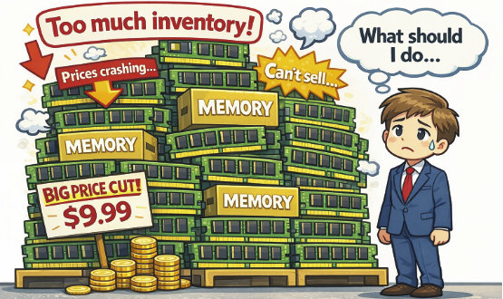 実は1989年、大量のメモリー在庫を抱える失敗があった。メモリーの過剰在庫だ。このときの256KBメモリーがいきなり1MBに主流が入れ替わった。古いメモリーは誰も欲しがらなくなるから価格は一気に下落する。高額で大量に仕入れたメモリーの行き場がなくなった。