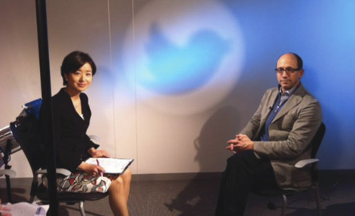 上の画像は、NEWS23X(TBSテレビ)膳場キャスターが来日中のtwitter社ディック・コストロCEOに東京のtwitter Japanで単独インタビューする様子。