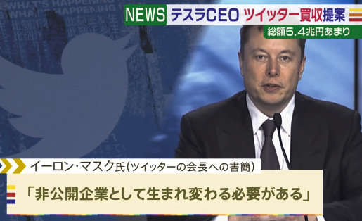マスクは取締役会宛にメッセージを送った、要約すれば「私はツイッターの可能性を信じて投資を行った。言論の自由は民主主義が機能するための必要な要件である。今のままでは会社は繁栄しない、そのためにはツイッターは非公開企業とすべきだ」とね。